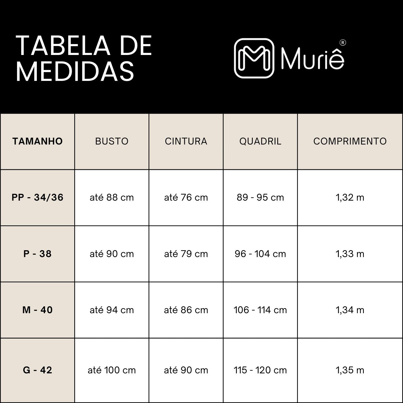 Na nossa tabela de medidas, você vai encontrar a opção que melhor se ajusta ao seu corpo! (medidas em circunferência)